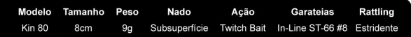 A Isca KIN 80 é uma isca sem barbela, clássica no mundo da pesca esportiva, com o tradicional nado witch bait que já garantiu incontáveis capturas. Tão consagrada entre os pescadores, é difícil encontrar quem não tenha várias em sua coleção!