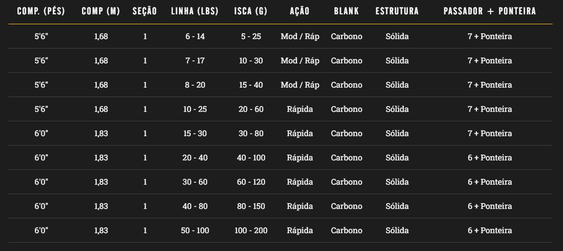 Possui blank em carbono sólido com pintura metálica, cabo inteiriço em EVA, além de ponteira e passadores em óxido de alumínio. Possui excelente ação e toda a resistência de uma vara sólida.